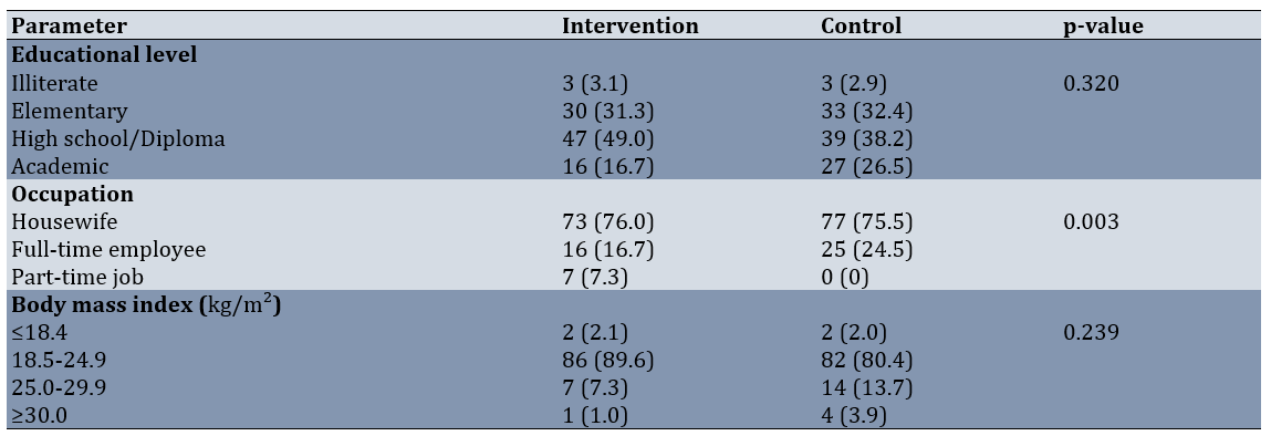 The two groups differed in terms of the occupations of the mothers, with mothers working full-time being more prevalent in the control group. The mean age of mothers in the Intervention group was 25.38±5.81 years, while in the Control group it was 26.13±6.58 years (p=0.204). Additionally, the mean gestational age in the Intervention group was 271.98±6.18 days, whereas in the Control group it was 273.82±7.52 days (p=0.013; Table 1).