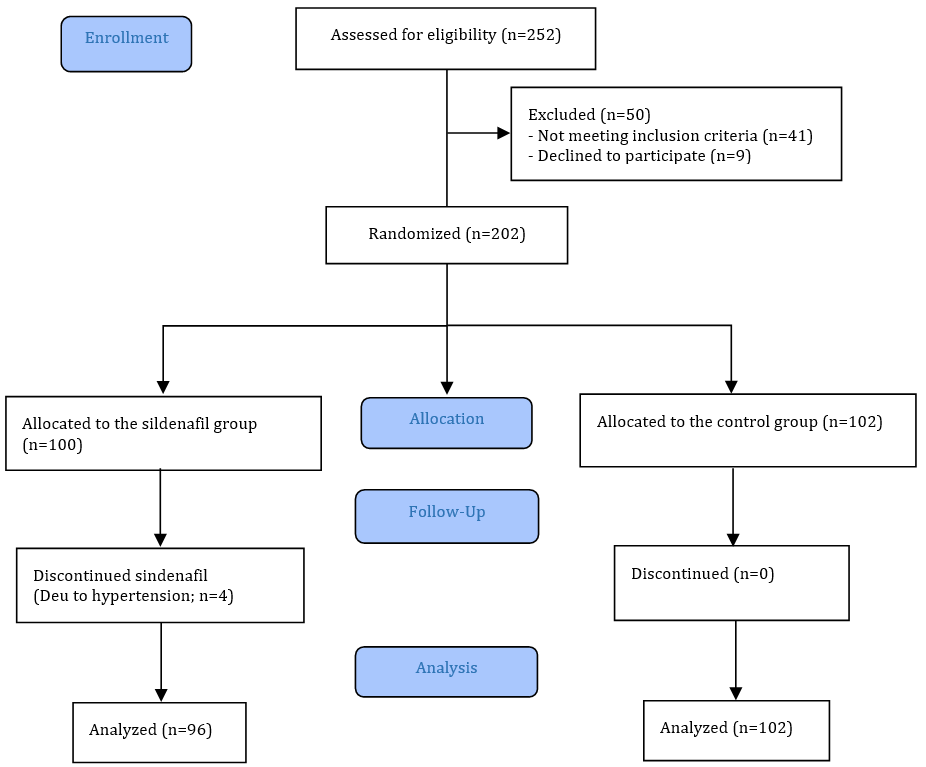We screened 252 cases according to the eligibility criteria, of which 50 cases were excluded (41 cases did not meet the inclusion criteria, and 9 cases declined to participate). A total of 202 cases met the inclusion criteria and were randomly divided into two groups (Figure 1). During the study, some cases in the intervention group discontinued participation, and ultimately, 96 cases in the sildenafil group and 102 cases in the control group were included in the analysis.