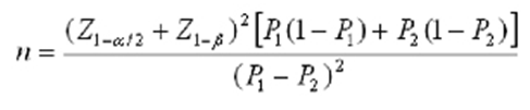 Taking into account the study by Turner et al. [15], a cesarean section rate of 18% in the intervention group and 36.7% in the control group, with a type I error of 0.05 and a type II error of 0.20, the total sample size was projected to consist of 100 individuals in each group using the following formula.