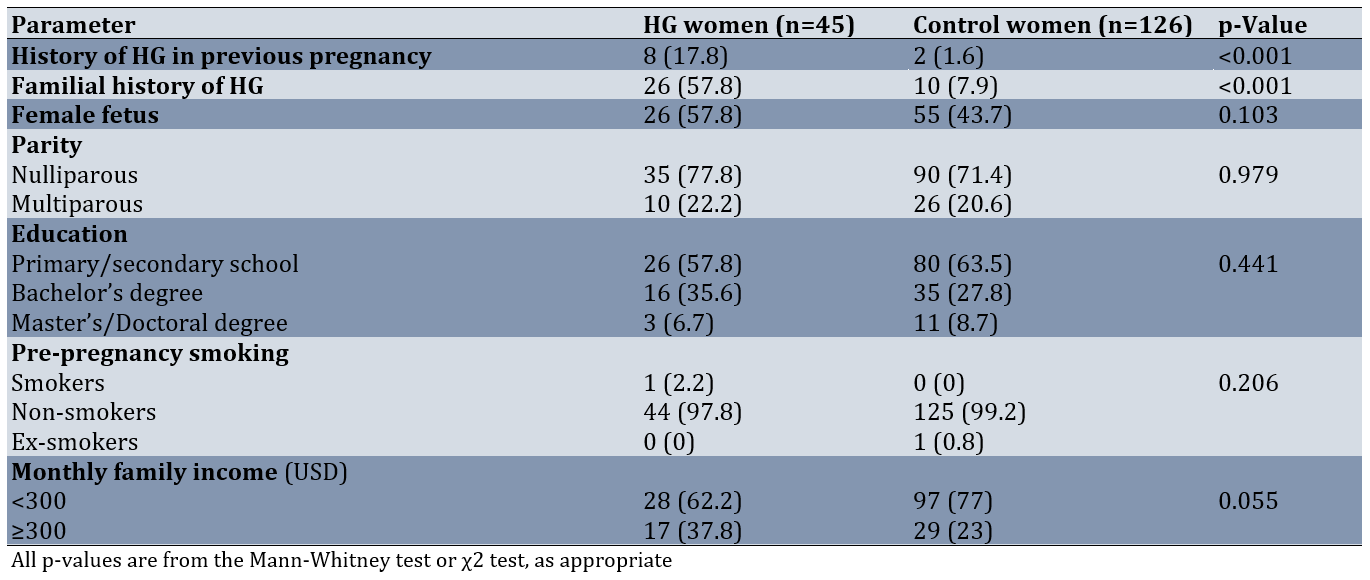 Table 1. Comparison of general characteristics of participants with hyperemesis gravidarum (HG) and controls