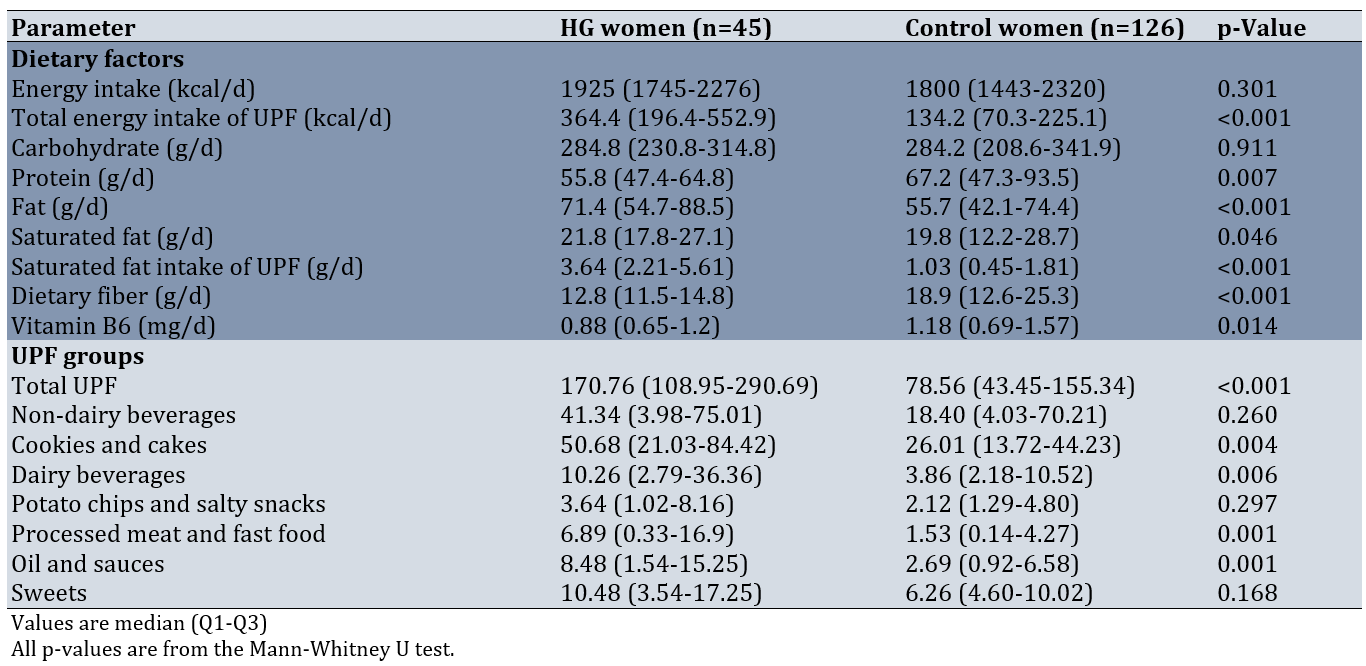 Given that UPFs are a major source of saturated fats and may promote systemic inflammation and oxidative stress—both hypothesized mechanisms in HG pathogenesis—we sought to investigate their potential role. To date, no study has examined the association between UPF intake and HG risk. Therefore, this case-control study aimed to evaluate whether pre-pregnancy consumption of UPFs is associated with higher odds of developing HG in Iranian women, while adjusting for key confounding factors.