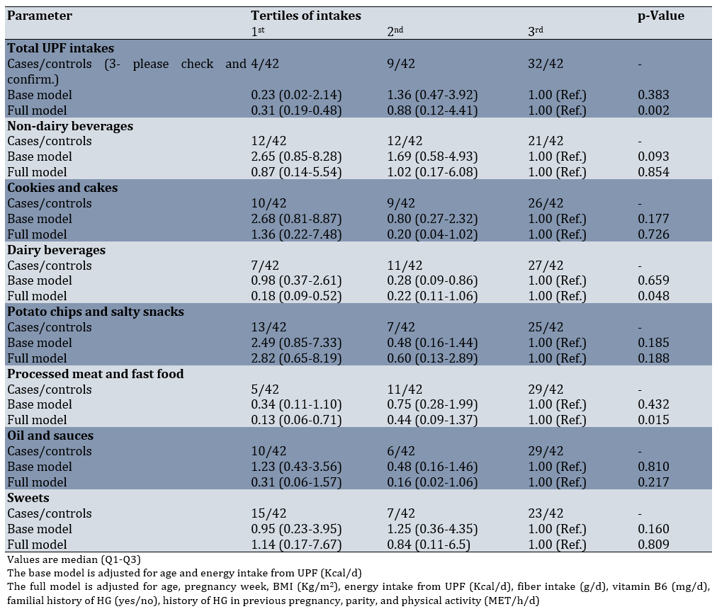 Table 3. Adjusted odds ratio (OR) estimates and 95% confidence intervals (CIs) for hyperemesis gravidarum (HG) according to the tertile of ultra-processed food (UPF) groups using a logistic regression model