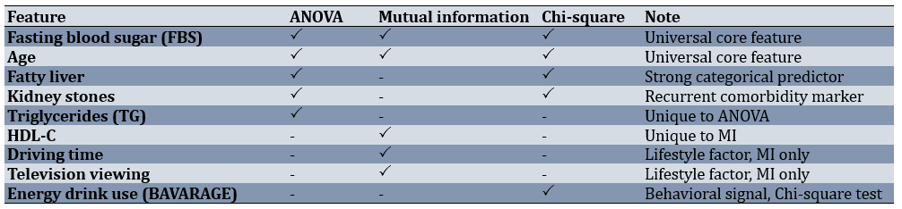 Because each method emphasized a slightly different mix of features, a side-by-side comparison helps identify the predictors that were stable across methods versus those that were method-specific. FBS and age were universal; fatty liver and kidney stones appeared in two methods, while TG (ANOVA), HDL-C, lifestyle factors (MI), and energy drink use (Chi-square test) were unique (Table 2).