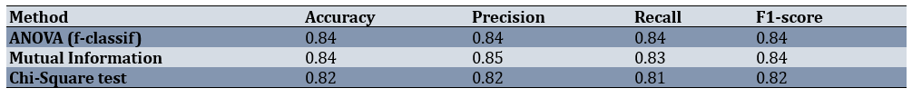 When logistic regression models were trained on the top five features from each method, both ANOVA and MI achieved strong and nearly identical results (Figure 4, Table 3). The ANOVA-based model produced an accuracy of 0.84 and an F1-score of 0.84, while the MI-based model also reached an accuracy of 0.84 and an F1-score of 0.84, with slightly higher precision (0.85). The Chi-square-based model performed slightly lower, with an accuracy of 0.82 and an F1-score of 0.82.
