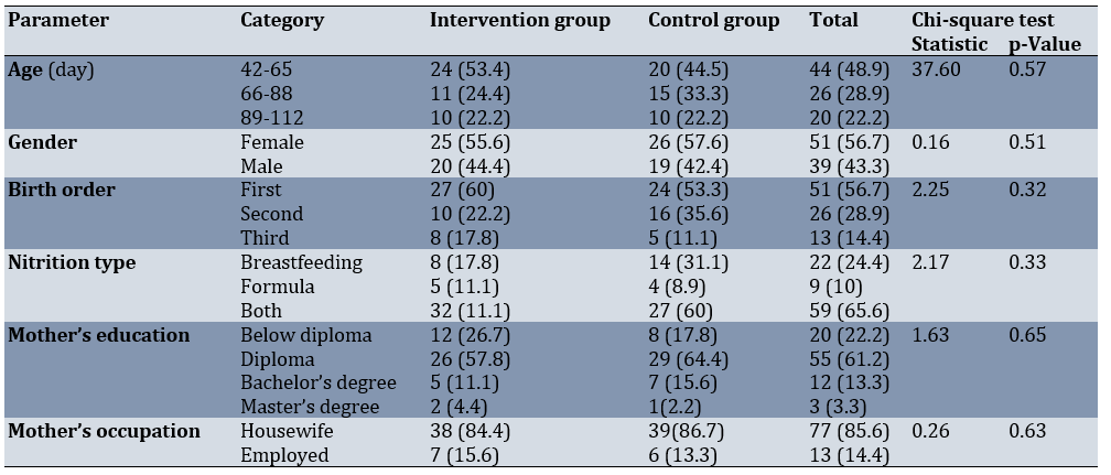 Ninety children participated in the two groups, intervention and control (45 each), and remained in the study until the end. The highest percentage of 48.9% (44 children) were in the age group of 42-65 days, and their overall mean age was reported to be 70.05±21.23 days. The highest frequency of 56.7% (46 children) were female. The overall mean weight of the children was 5275.55±906.32g (ranging from 3200 to 7200g).