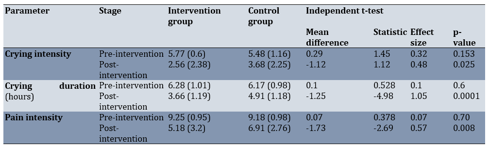 The Kolmogorov-Smirnov test indicated a normal distribution of the data. There was no statistically significant difference in the intensity and duration of crying, nor in pain intensity, between the intervention and control groups before the intervention. However, after the intervention, there were statistically significant differences in crying intensity (p=0.025), duration of crying (p=0.0001), and pain intensity (p=0.008) between the two groups (Table 2).