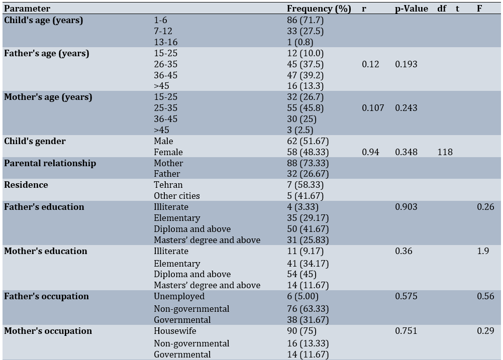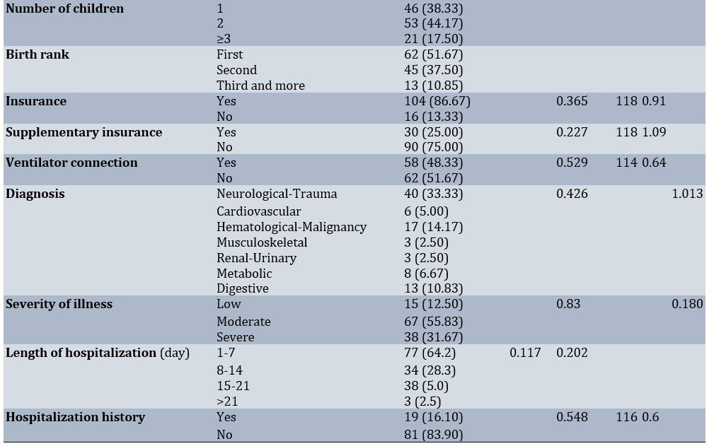 The average age of fathers was 35.77±8.10 years, mothers was 30.73±7.01 years, and children was 5.24±22.09 years. Additionally, 51.67% of the children were boys and 48.33% were girls, while 73.33% of mothers and 26.67% of fathers participated in the study. The majority of parents resided in Tehran (58.33%). Most fathers (41.67%) and mothers (45.00%) had a diploma or a higher education level. Furthermore, 63.33% of fathers were self-employed, and 75.00% of mothers were housewives. Most families (44.17%) had two children. In most cases (51.67%), the child was the firstborn in the family. Most children (86.67%) had health insurance, while 75.00% did not have supplementary insurance, and 51.67% of the children were not connected to a mechanical ventilator. The cause of hospitalization (33.33%) was reported as neurological/trauma in most cases. The average length of hospitalization for children was 8.07 days. Most of the children (83.90%) had no history of hospitalization in the intensive care unit (Table 1).