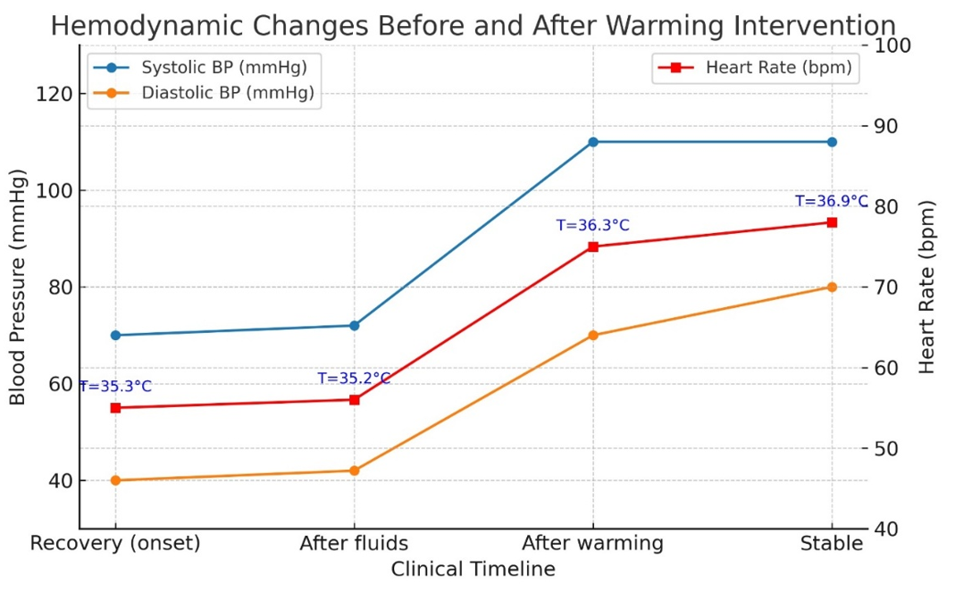 Hypothermia is a well-recognized but sometimes overlooked cause of postoperative hemodynamic instability [2-5]. It exerts its effects through several mechanisms. First, cardiac conduction slowing occurs because lower core temperatures decrease the pacemaker cell depolarization rate, leading to sinus bradycardia [1, 2]. Second, hypothermia reduces myocardial contractility due to impaired calcium handling and cross-bridge cycling [1]. Third, it causes peripheral vasodilation, including paradoxical vasodilation during rewarming, which reduces systemic vascular resistance [1, 3]. Finally, hypothermia impairs catecholamine responsiveness, resulting in blunted adrenergic receptor sensitivity and limiting compensatory tachycardia [1, 3].