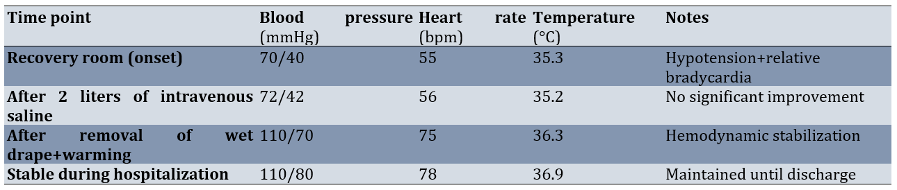 Following the removal of the wet drape, her vital signs improved significantly (blood pressure (BP): 110/70mmHg, pulse rate (PR): 75bpm, temperature: 36.3°C). During subsequent inpatient monitoring, she remained hemodynamically stable (BP: 110/80mmHg, temperature: 36.9°C) without further complications until discharge (Table 1 and Figure 1).