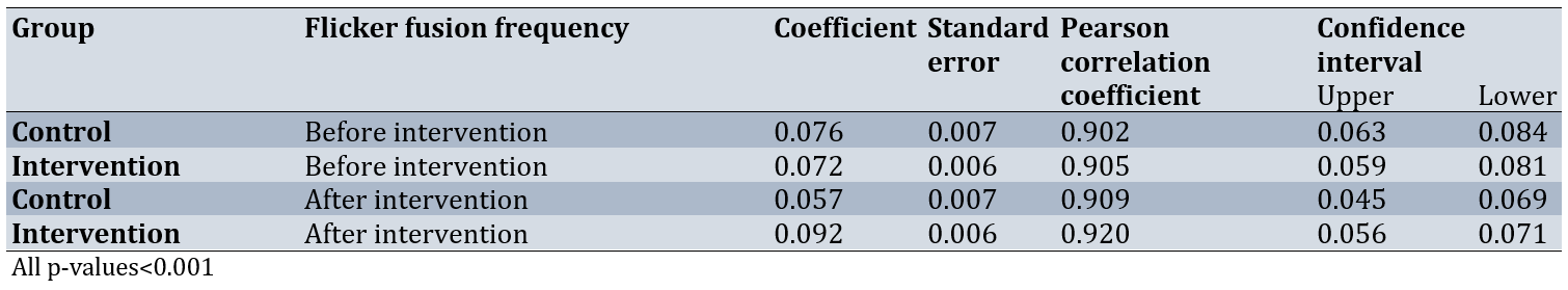 Linear regression analysis and the Pearson correlation coefficient indicated a direct relationship between flicker fusion frequency and the probability of correct responses in the Rapid Visual Processing Test in both phases and both groups (p<0.001). However, in the control group, a decrease in the probability of correct responses in the Rapid Visual Processing Test from the first to the second phase was accompanied by a significant decrease in flicker fusion frequency. Conversely, in the intervention group, the increase in the probability of correct responses in the rapid visual processing test was accompanied by a significant increase in flicker fusion frequency (p<0.001; Table 3).
