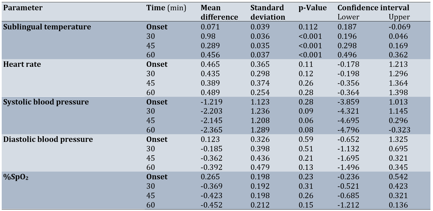 For sublingual temperature, the interaction effect of time and intervention was not significant (p>0.13), so that in the control group, there was no significant change in sublingual temperature from the first phase to the second phase, but the effect of the intervention in the intervention group was still significant and led to a significant decrease in the sublingual temperature of the intervention group (p<0.001; Table 4).