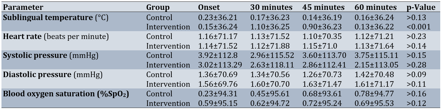 At baseline, there was no significant difference in sublingual temperature between the two groups (p=0.112), but after 45, 30 and 60 minutes, there was a significant decrease in the sublingual temperature of the intervention group (p<0.001) and there was no significant difference in this regard in the control group (p>0.001).